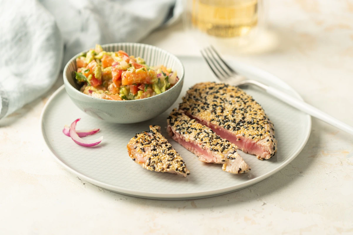 Простое и вкусное блюдо, которое очень быстро готовится и при этом эффектно и ярко выглядит на тарелке. А сочетание тунца с гуакамоле достаточно классическое.