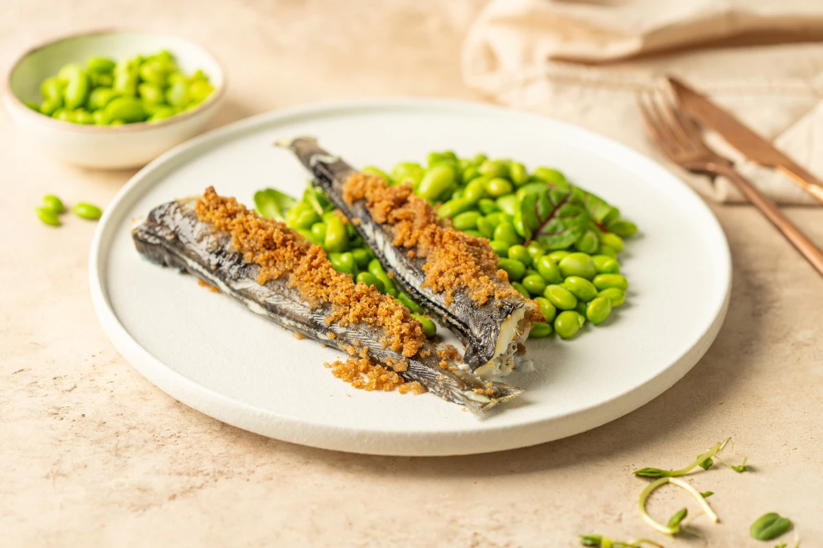 - Противень застелите пергаментом, выложите тушки рыбы. Сверху разложите крошку из сухарей.