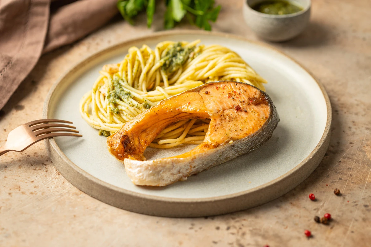 Спагетти с красной рыбой — это давно уже классика. А вот если заменить сливочный соус на песто, можно попробовать новое сочетание вкусов.