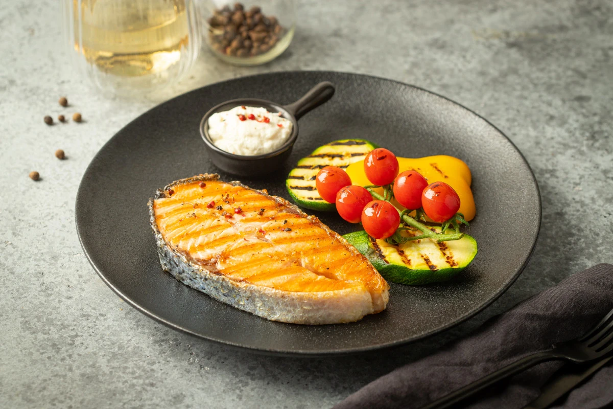 Сёмга — довольно жирная красная рыба, поэтому подавать ли к ней сырный соус, решать только вам. А вот овощи гриль рекомендуем не игнорировать: этот дуэт идеален.