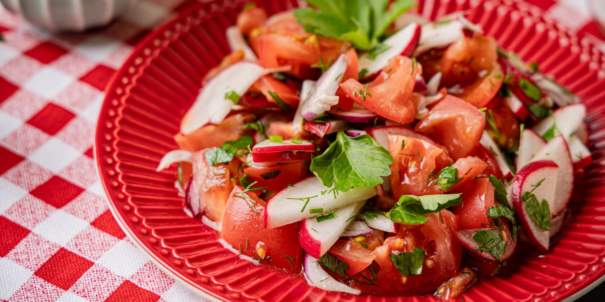 Салат с редисом, помидорами и красным луком