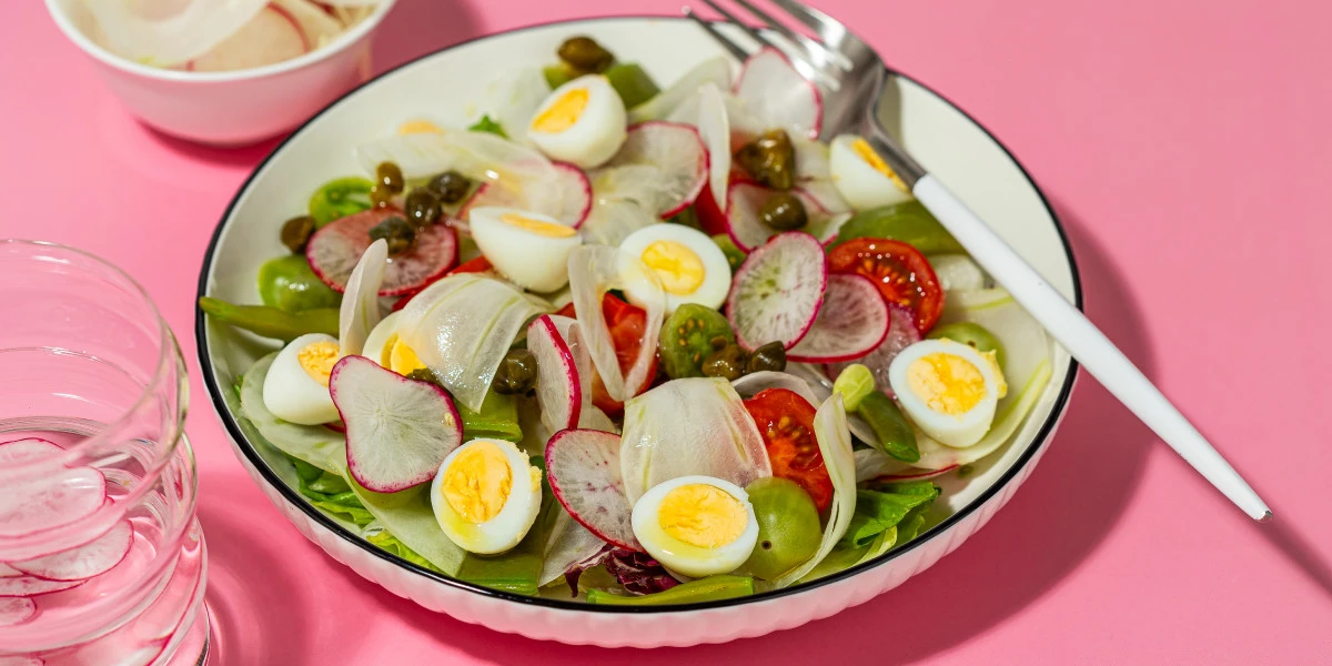 6. Выложите на тарелку салатный микс. Сверху — половинки черри, ломтики фенхеля и редиса, фасоль, разрезанные пополам перепелиные яйца, каперсы.