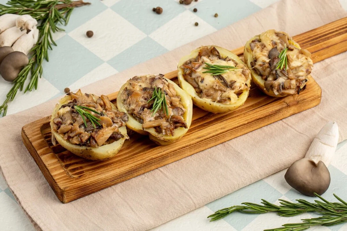 - Заполните половинки картофеля смесью вёшенок и сыра.
