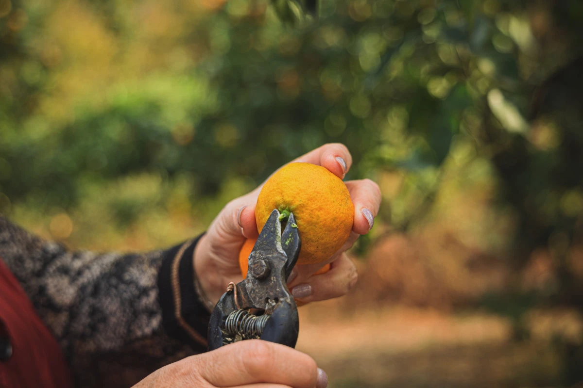 Каждому мандарину аккуратно подрезают веточку