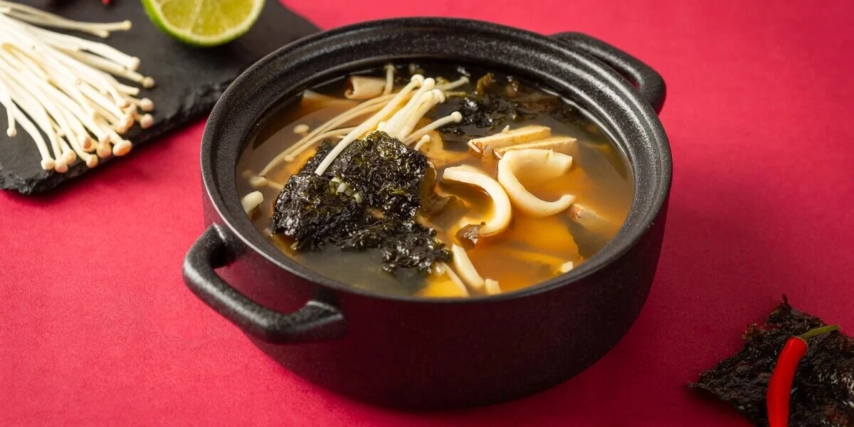 - Как только суп закипит, выдавите в него сок половины лайма или по вкусу, добавьте грибы эноки, разрезанные пополам водоросли нори и варите 2 минуты. Добавьте 3 ст. ложки или по вкусу соевого соуса, тофу, перемешайте и подавайте.