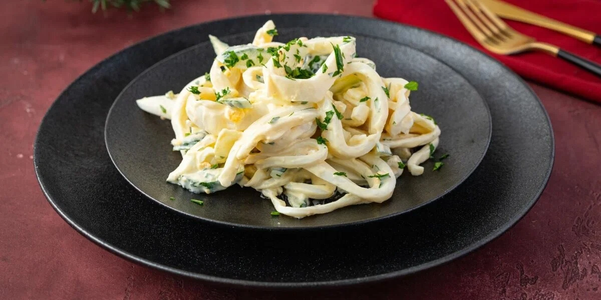 Салат с кальмаром, яйцом и огурцом