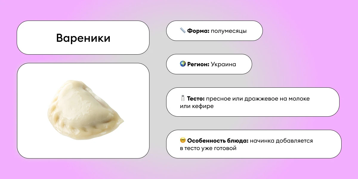 Пельмени с мясом, вареники с картошкой, ягодами, фруктами или творогом. Хотя варианты вареников с мясом тоже встречаются. Очень универсальны: могут быть и основным блюдом, и десертом.