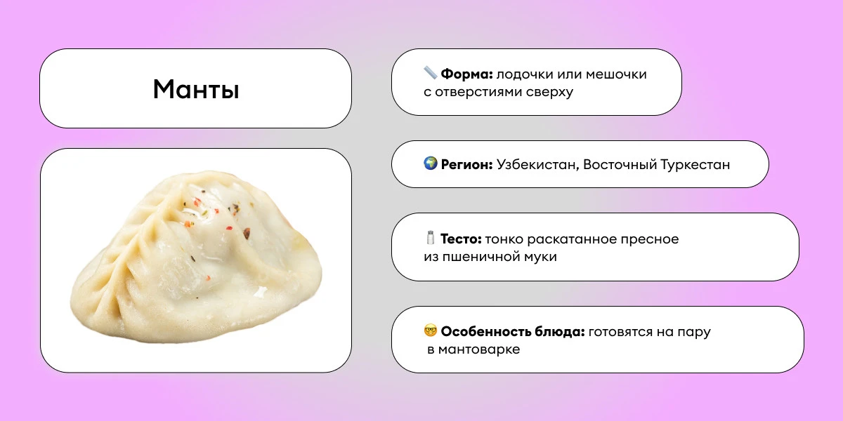 Считается, что манты изобрели уйгуры — народ Восточного Туркестана . Там же и готовили это блюдо в форме маленьких мешочков с отверстиями сверху. А вот в Узбекистане манты делают в форме лодочек . Есть и другие вариации, но классической считается именно уйгурская. Традиционная подача этого блюда — с поджаркой из лука и кислым молоком — катыком.