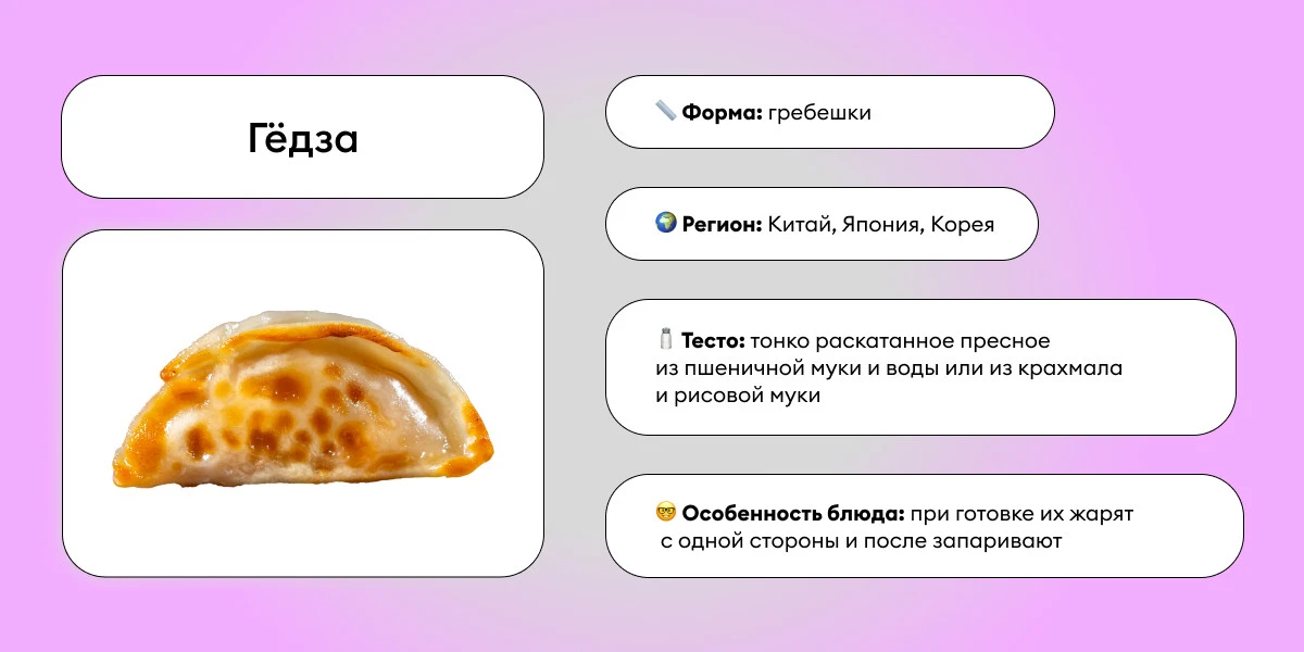 Пожалуй, гёдза — это самый молодой вариант пельменей. Привезли его японцы из Маньчжурии в середине XX века. Изначально начинка для гёдза состояла из свиного фарша, пекинской капусты, имбиря, чеснока и кунжутного масла. Однако сегодня их готовят и с рыбой, и с курицей, и с овощами.