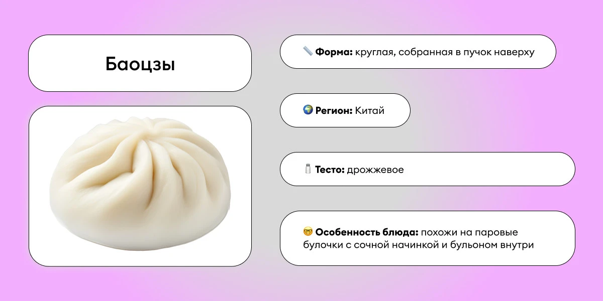 Не то булочка, не то пельмень. Нежное тесто на пару с самыми разными начинками: мясом , грибами, овощами , тофу или же сладкими вариациями. Считается, что монгольские буузы пошли именно от баоцзы, только в отличие от китайских — начинка исключительно мясная.