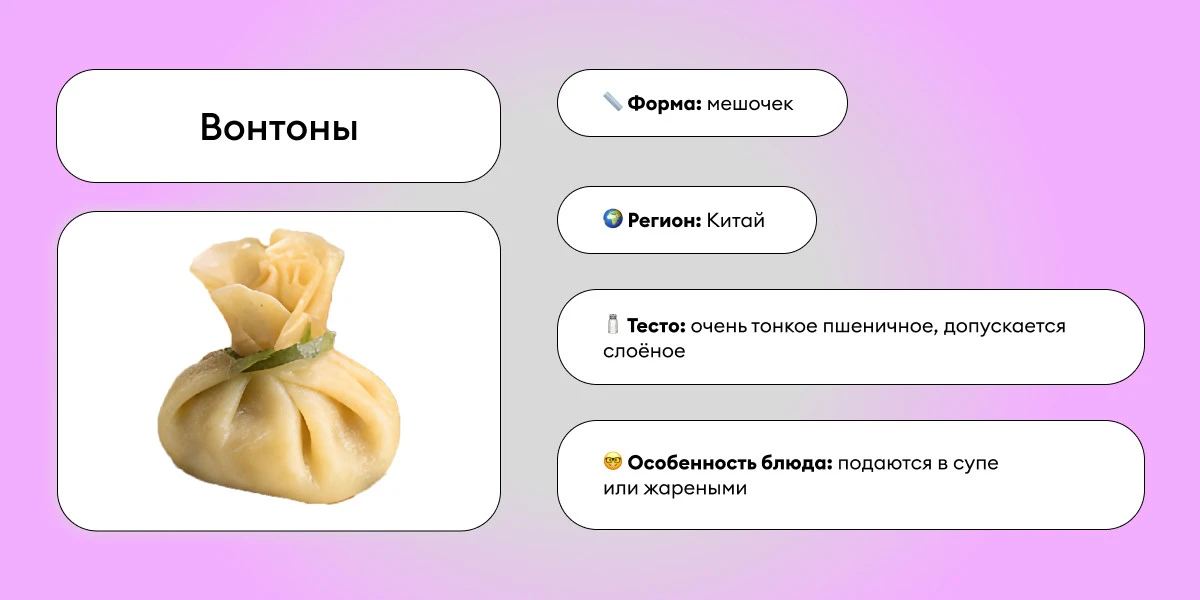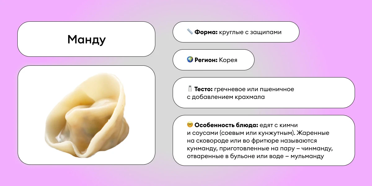 И тут версиями и вариациями нас не обделили: азиатские баоцзы, гёдза и манду; итальянские равиоли и тортеллини; грузинские хинкали и белорусско-польско-литовские мучные колдуны… А начинок и подач сколько! Мясные, постные, сладкие — в супе, в соусе, с кетчунезом, в конце концов. :)