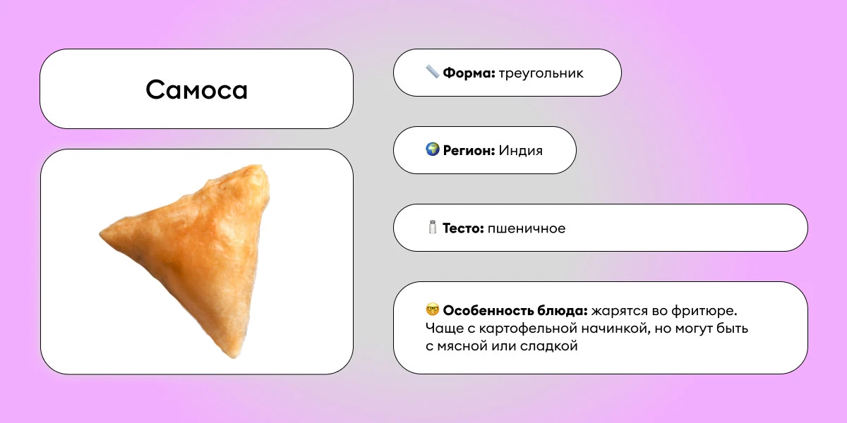 Индийский вариант жареных пельменей в виде мешочков с пряным картофелем, овощами или мясом. Не забудьте специи. Много специй. :)