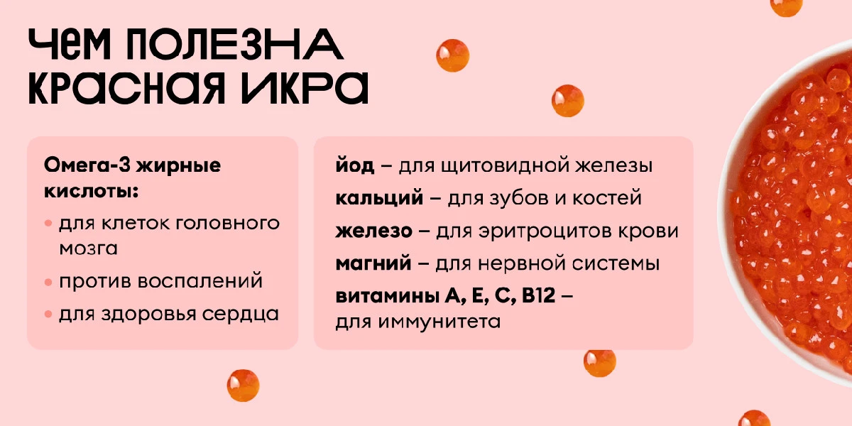 Красная икра содержит питательные вещества, необходимые для поддержания физического и психического здоровья:.