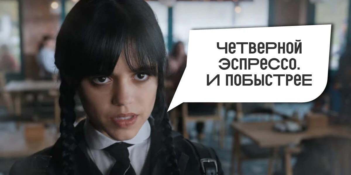 Тут вспомнилась мне сцена из «Уэнсдей», где Джена Ортега заказывает кофе, который звучит как самоубийство.