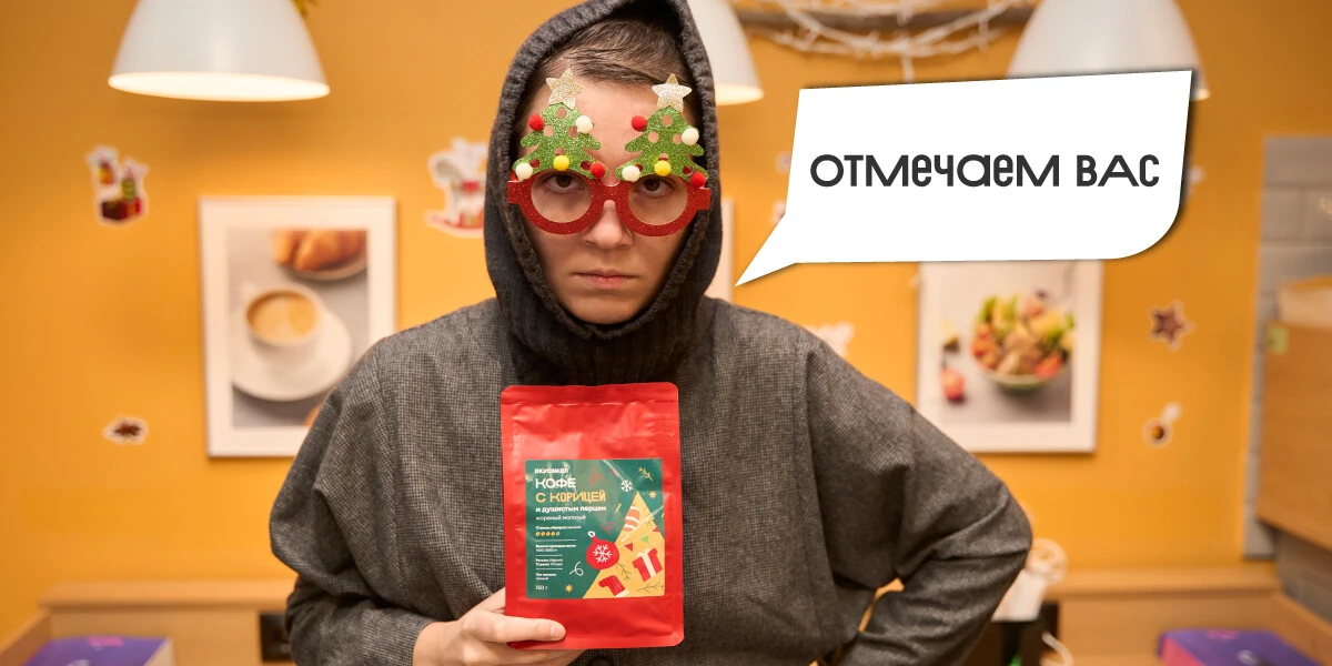 — У меня в руках, как вы видите, кофе с корицей. Поэтому хочу напомнить, что в этом году мы Отмечаем вас (так называется новогодняя кампания ВВ, если вы ещё не в курсе). А это значит, что каждый день вы можете получать подарки с адвент-ёлки ВкусВилл.