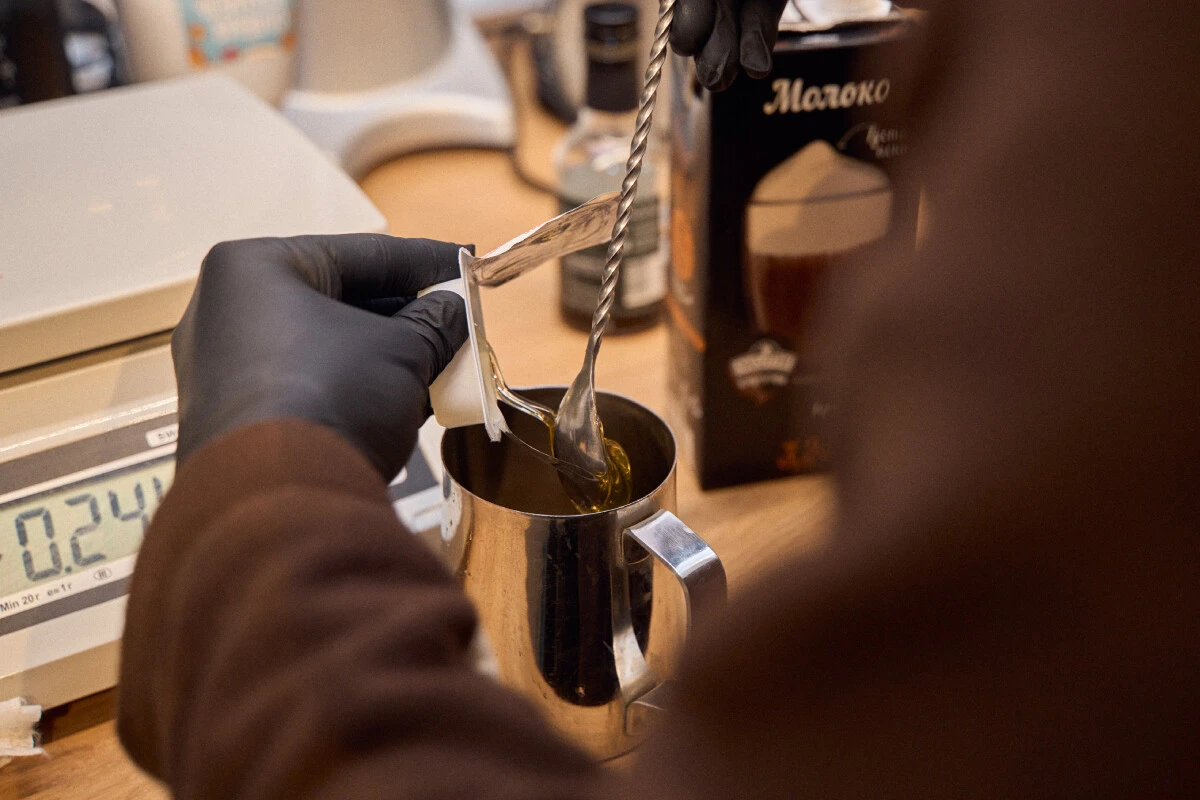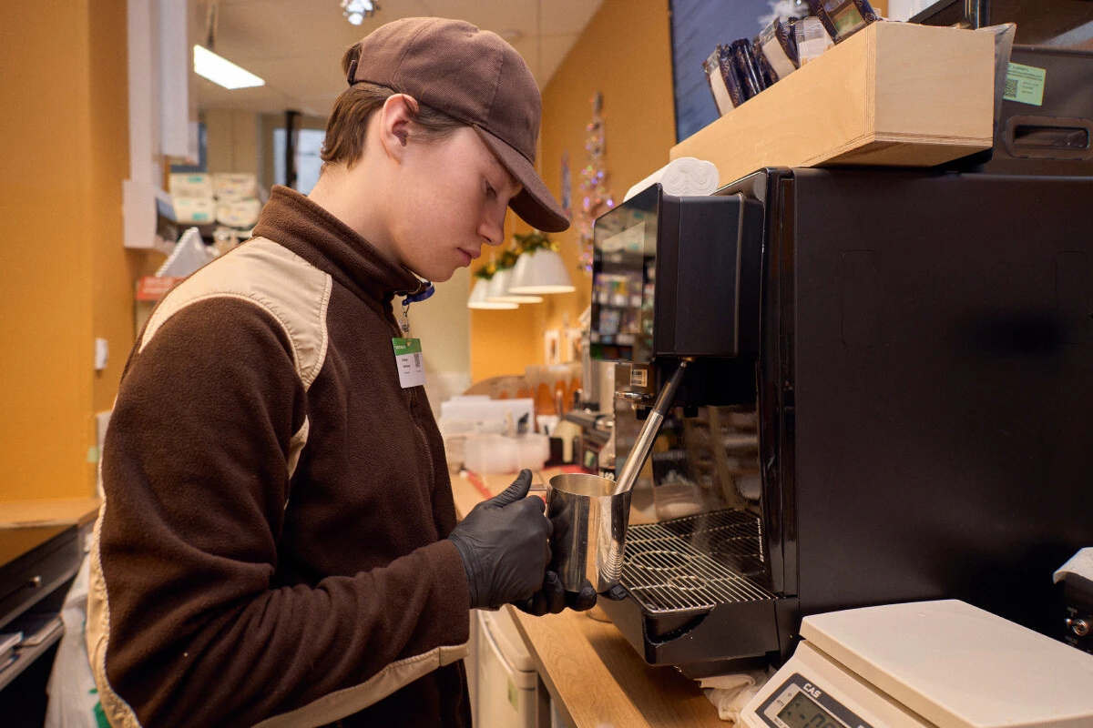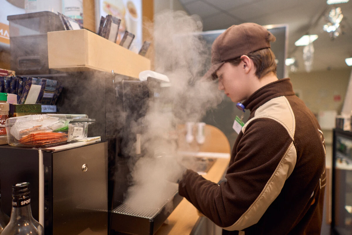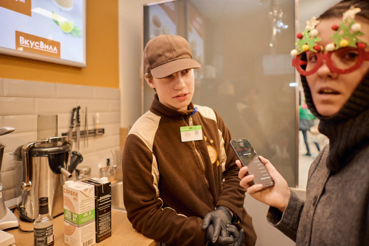 Саша переживал, что согласился на интервью. Он варит кофе четвёртый месяц, владеет навыками латте-арта и ждёт, когда в кафе ВкусВилла появится банановое молоко.