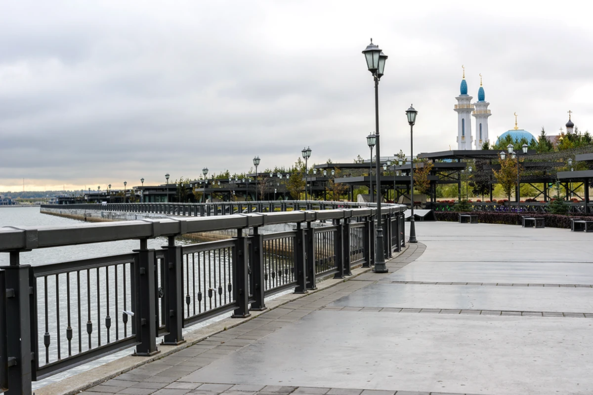 Примерно на середине маршрута от Кремля до экстрим-парка «Урам» установлены «речные ворота» — они открывают вид на реку сквозь «балконы» у воды, а ещё у них можно узнать легенды и истории реки Казанки: для этого встаньте между колоннами, сфотографируйте QR-код и выберите нужный язык.
