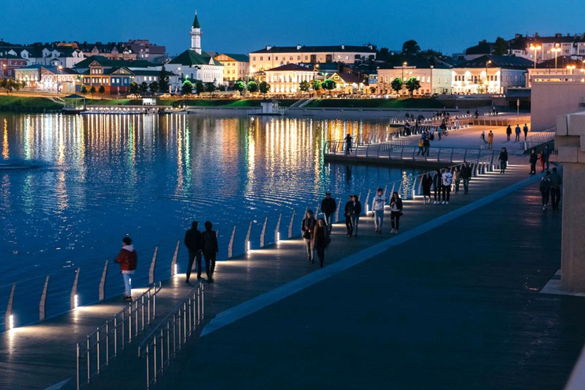 Часть Кремлёвской набережной построили в 2013 году к Универсиаде — это был типичный туристический аттракцион с ресторанами и кафе, с каруселью. Сейчас это прогулочная зона длиной в три километра с прокатом велосипедов и роликовых коньков летом, прокатом коньков и чуть ли не самым протяженным катком в Европе зимой, кафе и ресторанами, сувенирными лавками, зонами для воркаута, фортепиано, на котором может сыграть любой, и многим другим.