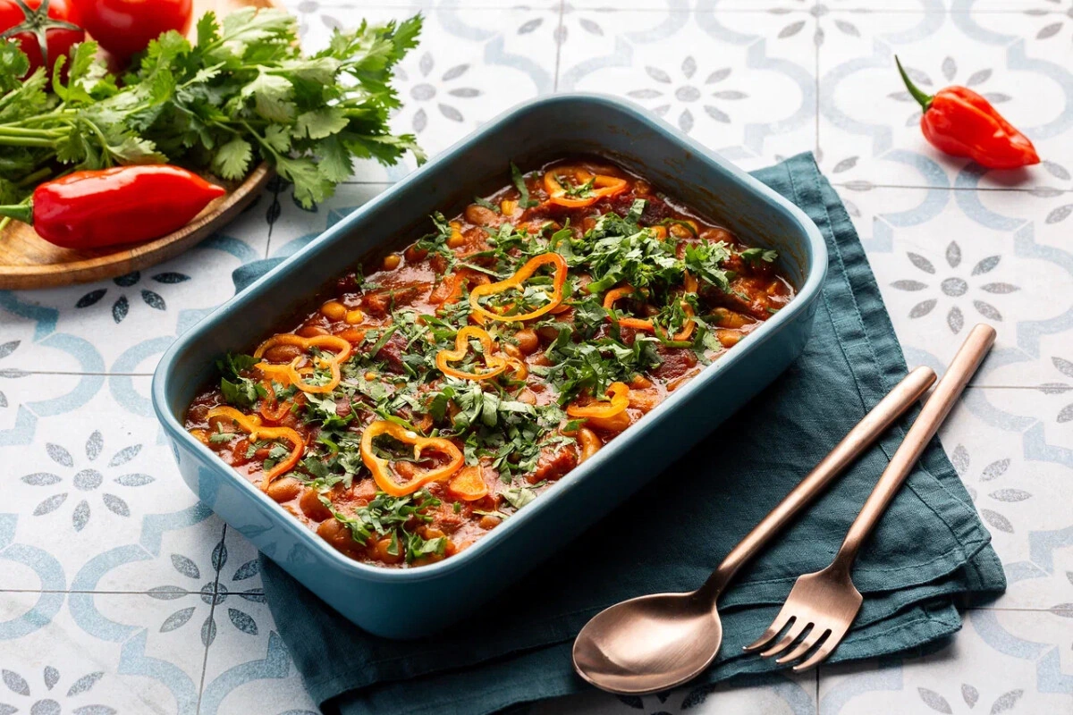 Идеальное блюдо для большой компании: быстрое, сытное и вкусное! Остроту соуса легко регулировать: добавляйте больше или меньше перца хабанеро по вкусу. По желанию вместо начос к блюду можно подать слегка подпечённые лепёшки-тортильи.