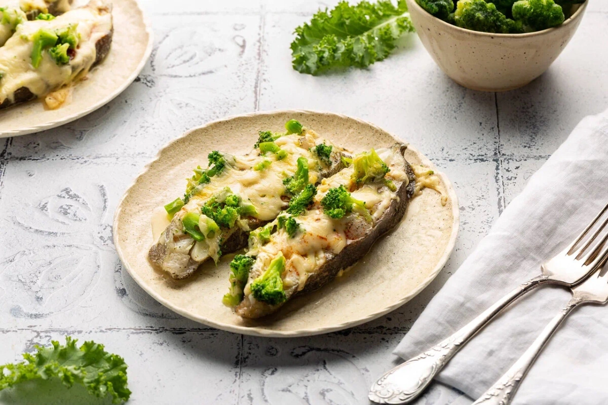 - Поверх палтуса выложите шапочку из сыра с брокколи и запекайте в микроволновке в течение 12–15 минут.