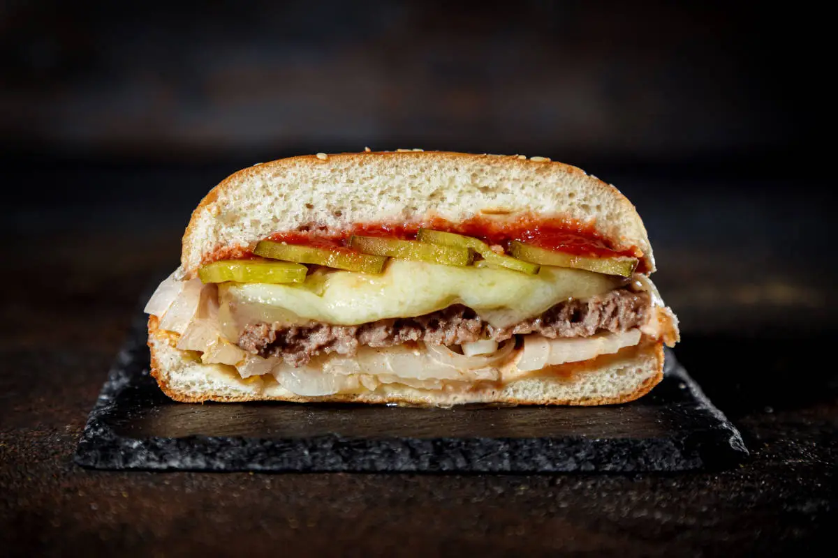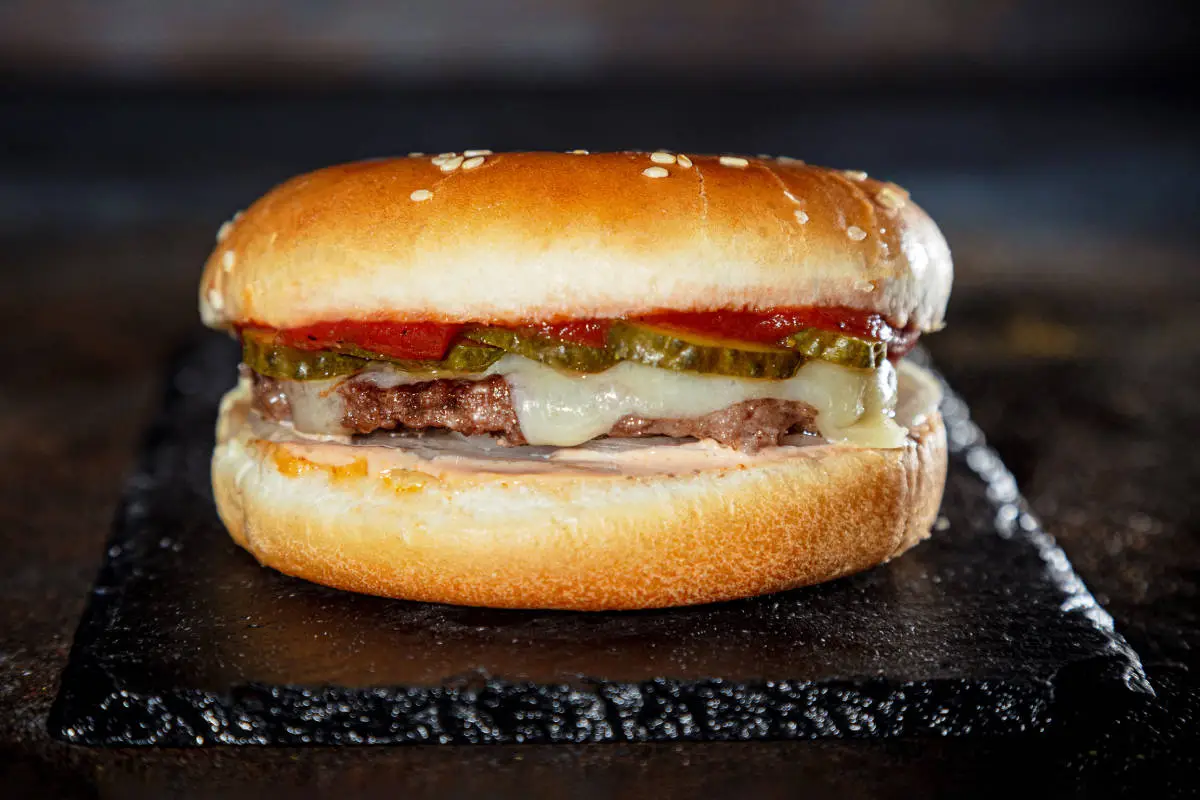 - между половинками пшеничной булочки с кунжутом залегает котлета, в которой нет ничего, кроме говядины,