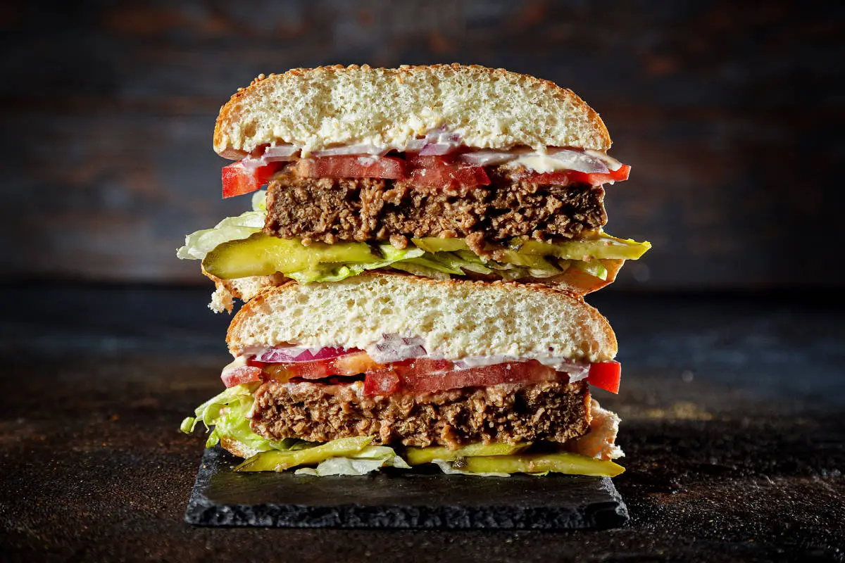 В бургере с растительным «мясом» тоже нет ни искусственных консервантов и усилителей вкуса, ни продуктов животного происхождения. Котлета из растительного белка получилась очень текстурной и насыщенной по вкусу, поэтому бургер понравится даже тем, кто не отказывается от животных продуктов. Её вкус оттеняют овощи (салат романо, слайсы томата и маринованных огурцов и колечки лука). Для соуса мы смешиваем майонез с соевым соусом, горчицей и сиропом топинамбура. Как видите, этот соус тоже с лёгкостью можно повторить на любой кухне.