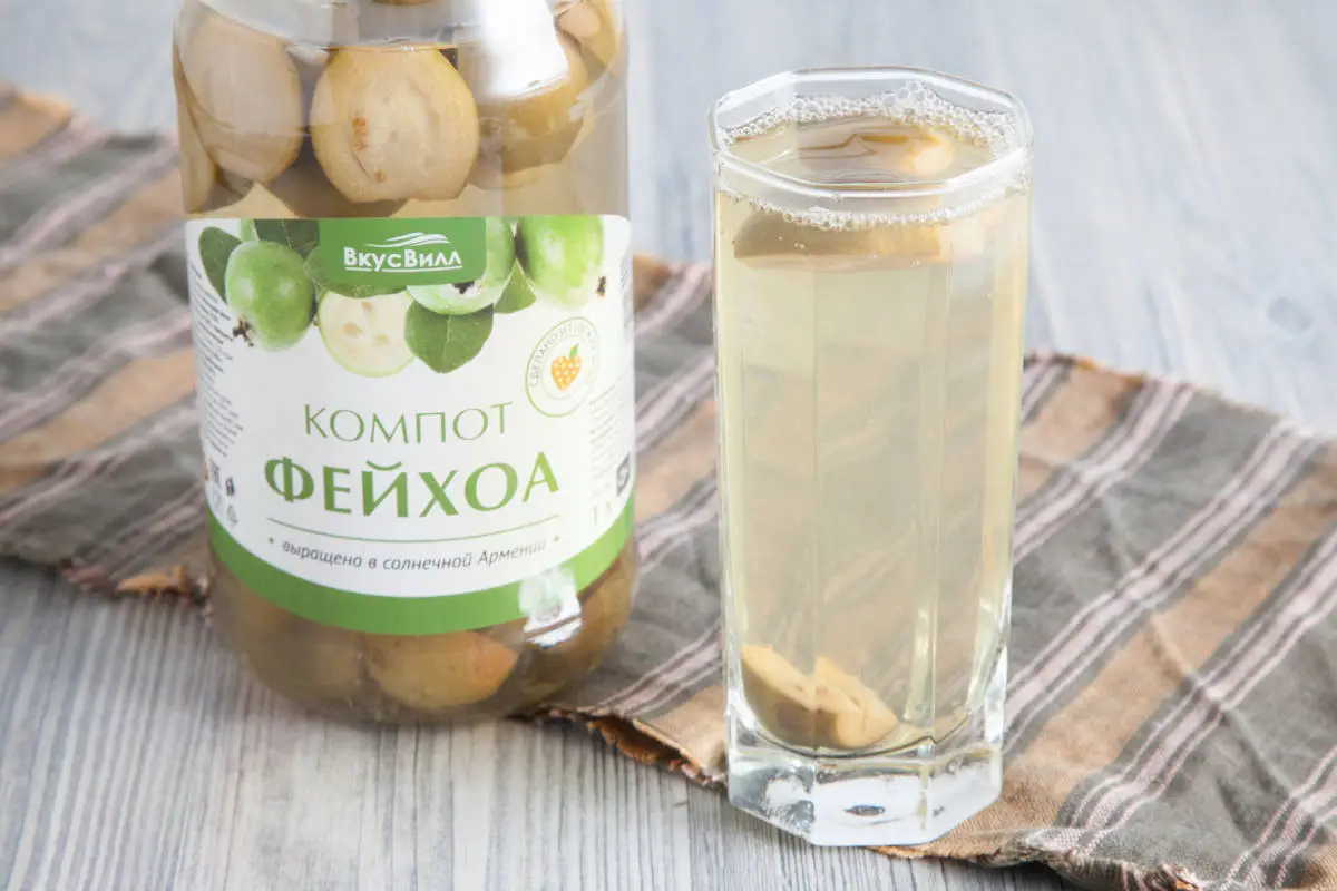 Компот из ягод этого растения тоже можно закатать в банки на зиму либо сварить и сразу подать к столу. Но можно и купить готовый во ВкусВилле. В идеале любые компоты есть вместе с плодами — так вы получите больше клетчатки. Однако зернистая мякоть фейхоа может быть неуместна в прозрачном жидком напитке, поэтому стоит компот перед подачей процедить.