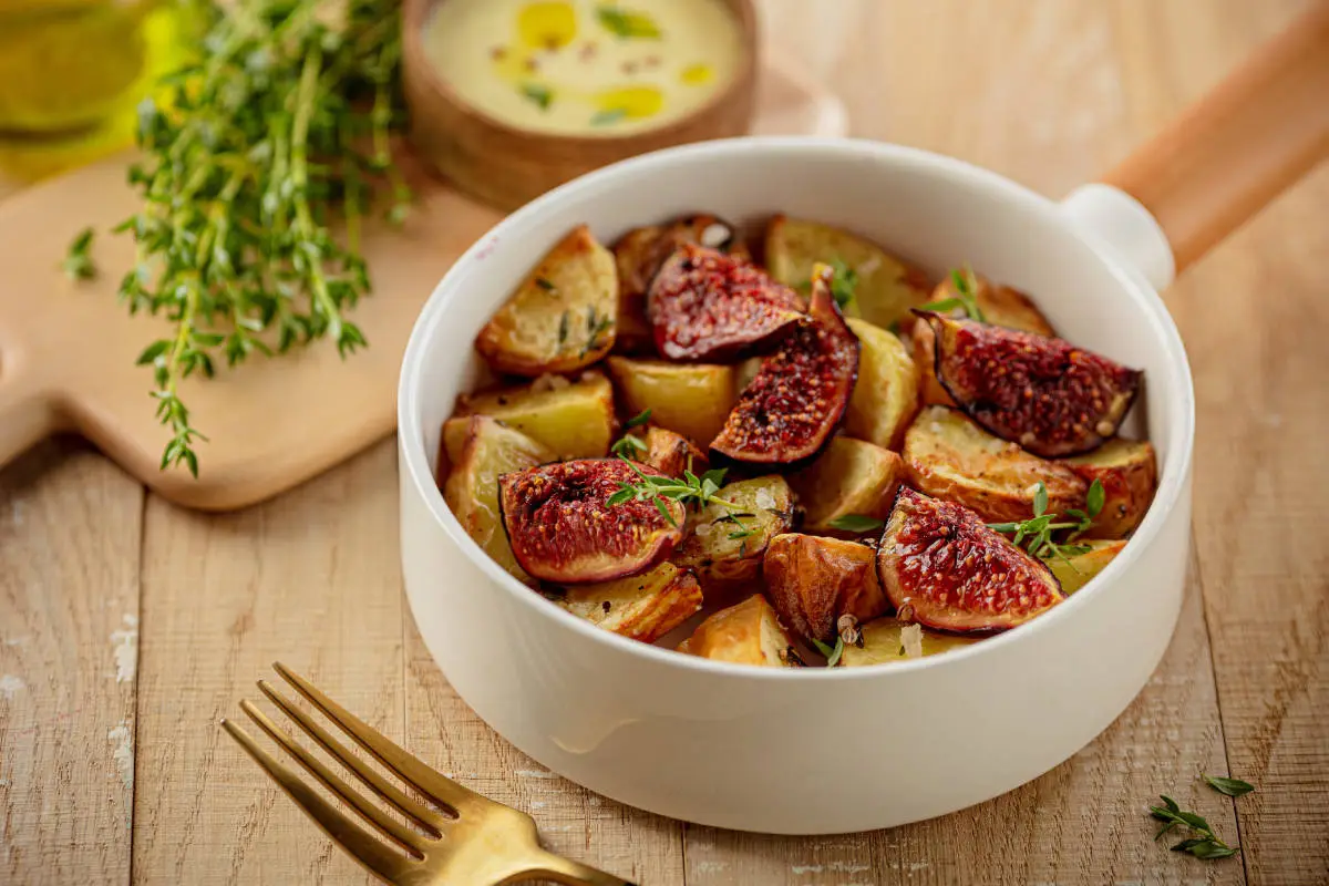- Обжарьте картофель с розмарином и инжиром на оливковом масле.