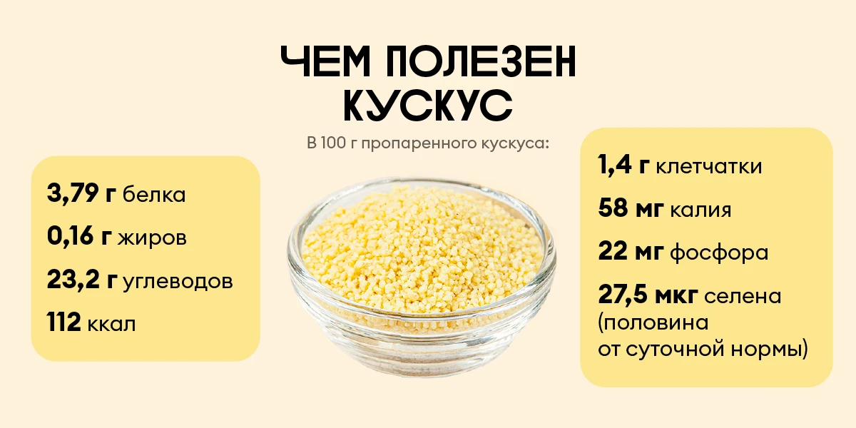 Кускус — доступный источник сложных углеводов, которые служат «топливом» для нашего организма. Он не содержит холестерина и богат витаминами группы B.