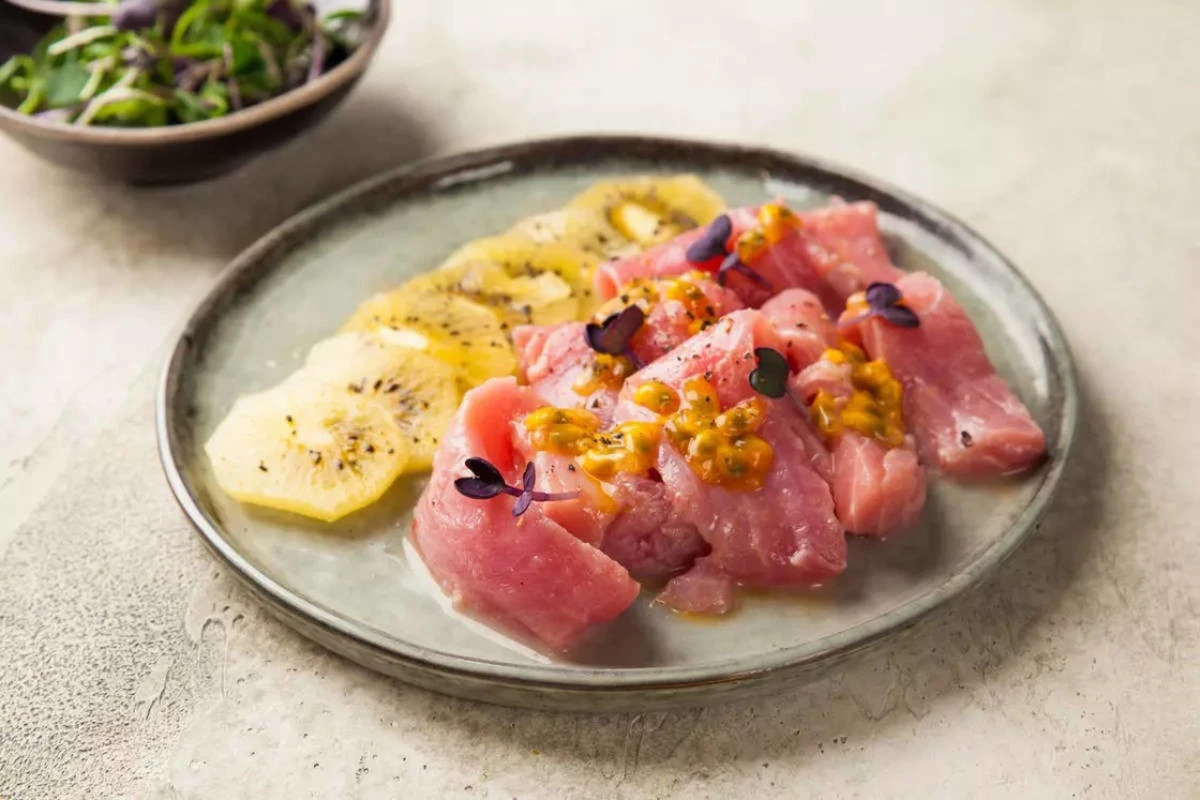Понадобится: 200 г тунца, по 2 ст. л. соков лимона и лайма, 1 киви, 1 маракуйя, 1 ч. л. оливкового масла, соль по вкусу.