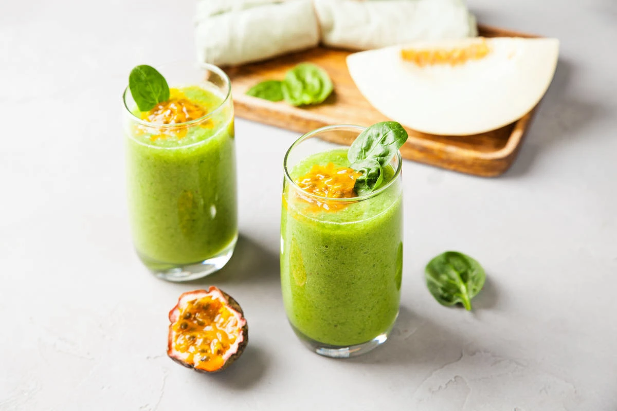 Понадобится: 350 г мякоти дыни, 30 г шпината, 1 банан, 1 маракуйя, 500 мл воды.
