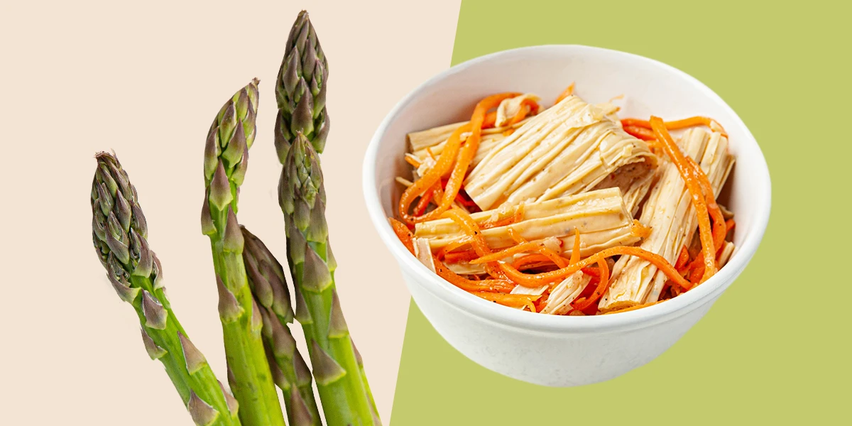 Соевая спаржа, или фучжу, — это вкусный соевый продукт, достойный занять место в рационе. Чаще всего фучжу (юба, кожура тофу или соевый бамбук) используют в салатах в сочетании с морковью, грибами, луком, томатами, огурцами, листовой зеленью. В ассортименте ВкусВилла есть салат по-корейски с фучжу. «Очень вкусная спаржа с морковкой! С большим удовольствием буду покупать ещё», — пишет о нём в отзывах Екатерина.