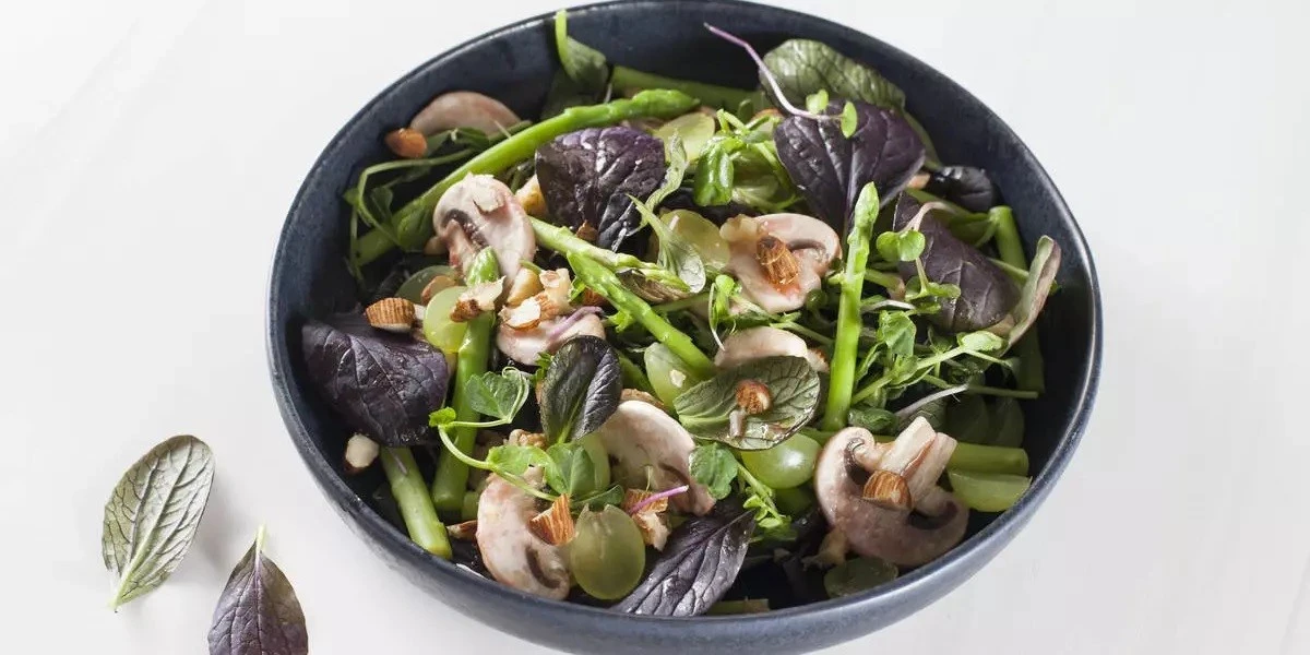 Понадобятся: 50 г салата пакчой, 25 г свежей микрозелени, 3–4 шампиньона, 100 г мини-побегов спаржи, 60 г кишмиша, по 3–5 ядер грецких орехов и миндаля, сок одного апельсина, 1 ст. ложка оливкового масла, соль.