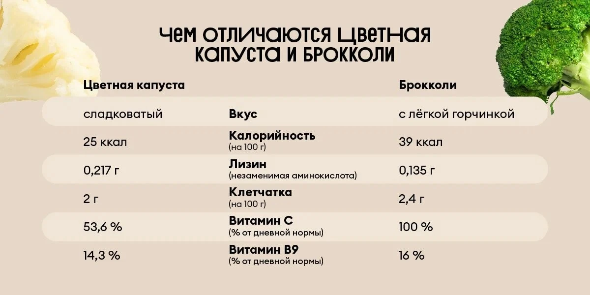 - Цветная капуста менее калорийна: в 100 г сырого овоща содержится 25 ккал, а в брокколи — 39.