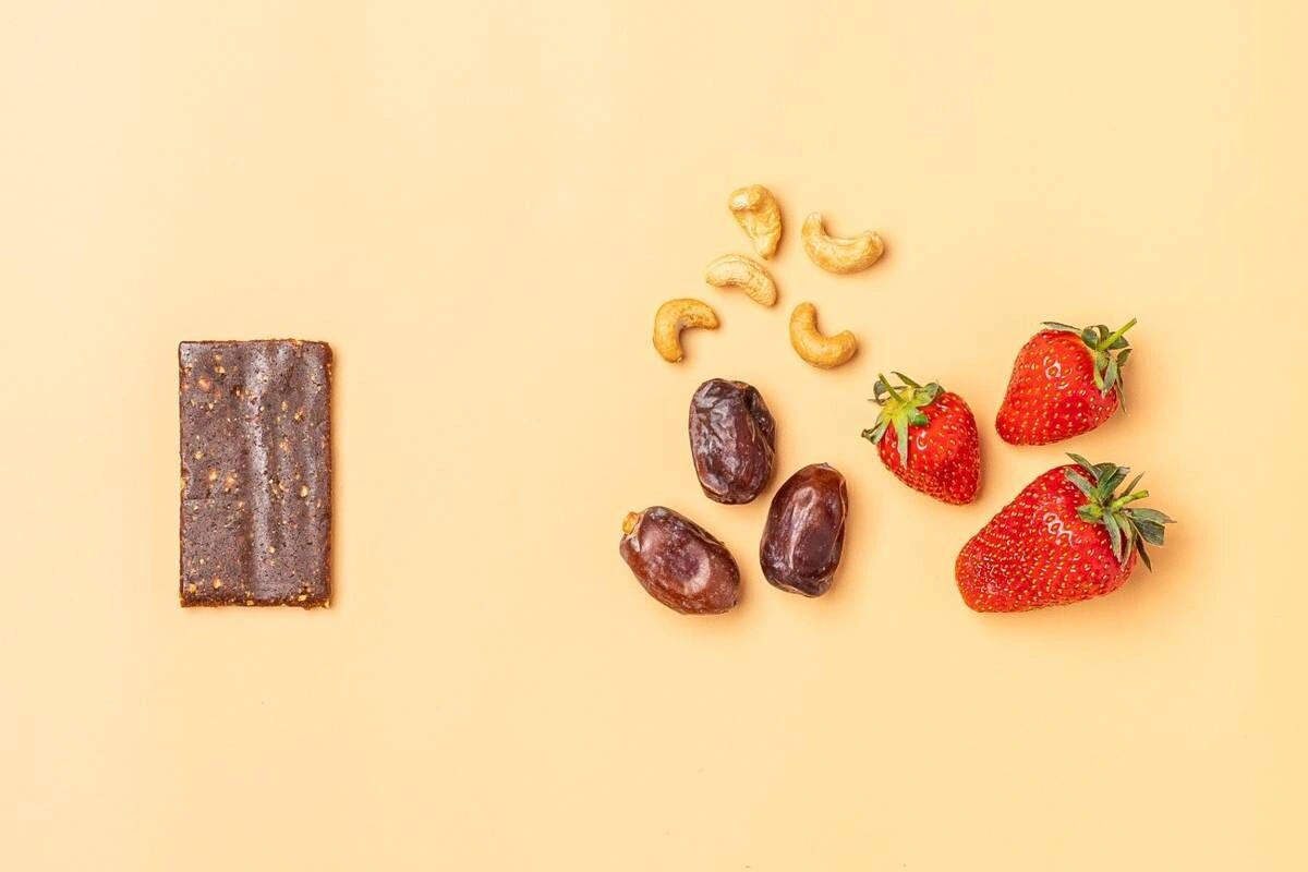 Ещё один детский продукт готовят всего из трёх ингредиентов: фиников, орехов кешью и клубники. Догадались, о каком продукте идёт речь? Это фруктово-ореховый батончик «Клубника». В нём нет рафинированного сахара, ароматизаторов, яблочного сока. Сладость ему придаёт только финиковая паста.