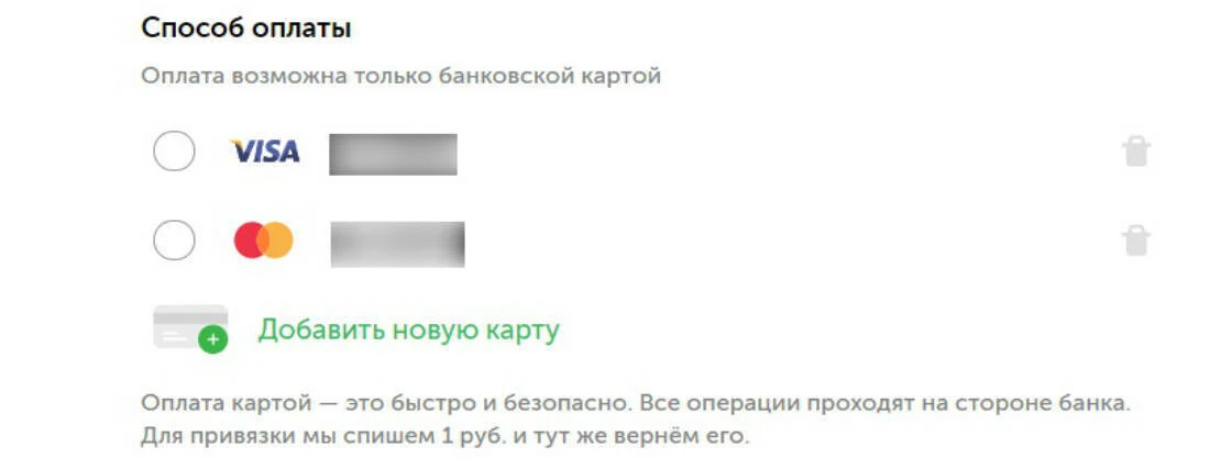 Оплатить заказ можно онлайн банковской картой, Google Pay и Apple Pay или при получении — наличными и картой курьеру. При первой привязке карты для онлайн-оплаты мы спишем с неё 1 рубль и тут же вернём его.