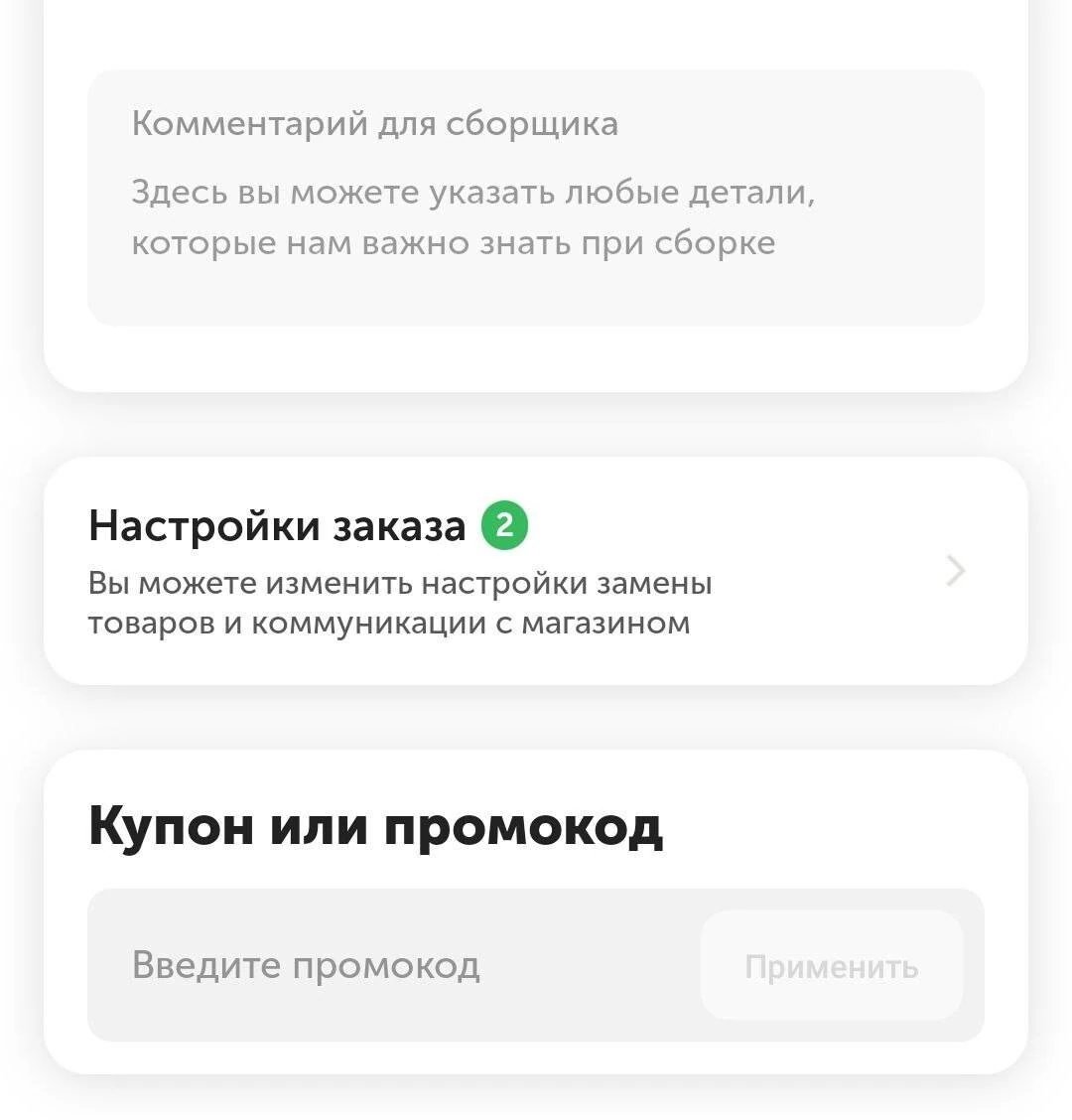 Если у вас есть промокод или на карту начислен купон, заказ соответствует заявленным условиям использования (увидеть их можно, нажав на уже добавленный купон или промокод внизу корзины), перейдите к полю «Применить купон или промокод» и выполните указанные там действия. Скидка автоматически пройдёт по вашей покупке.