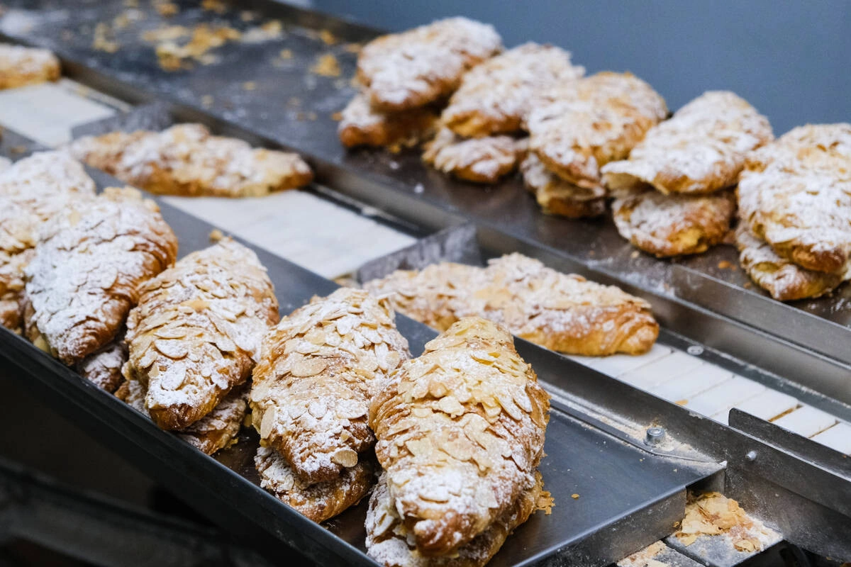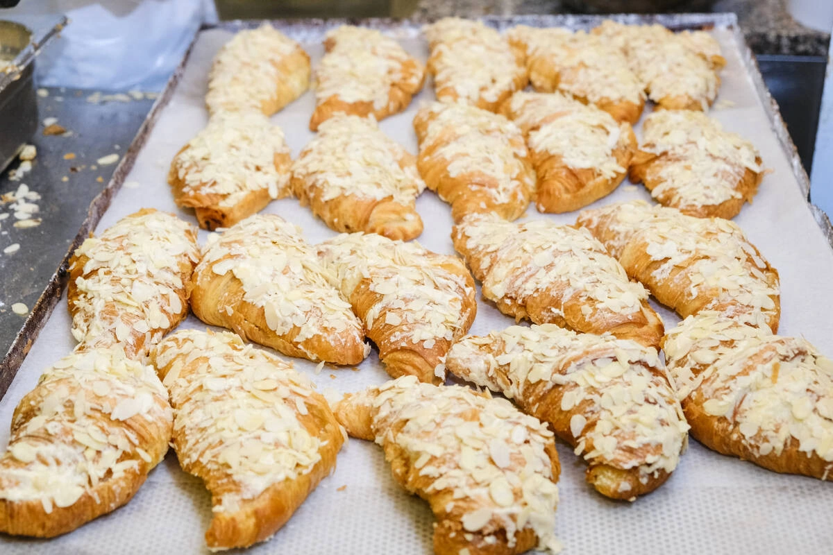 Неожиданно для нас, знаменитый миндальный круассан был создан для переработки непроданных изделий. Конечно, они никогда не выкладывались на продажу, так как на витрине должны лежать лишь тёплые, только что выпеченные изделия. Экономные пекари придумали разрезать круассан пополам, пропитывать сахарным сиропом, в который могли добавить и коньяк, промазывать миндальным кремом, а сверху украшать миндальными лепестками и повторно выпекать.