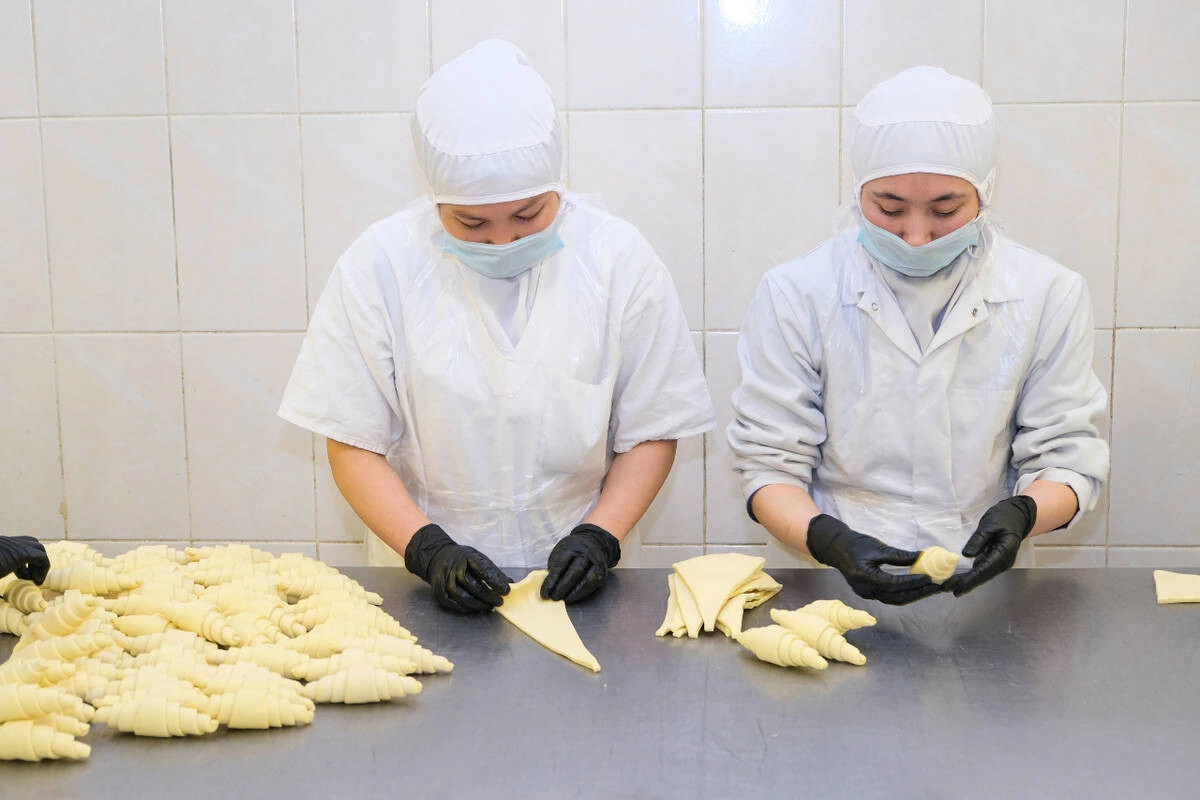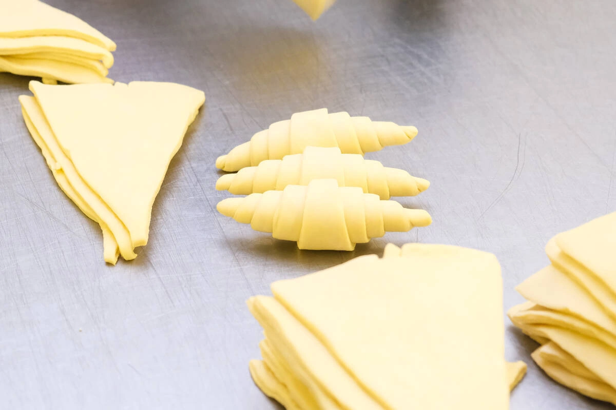 Готовое тесто прослаивают сливочным маслом, охлаждают и разрезают на специальном аппарате на маленькие треугольники. А дальше дело рук формовщиц – так в пекарне называют девушек-специалистов, которые формируют заготовки. Они сворачивают треугольники теста в маленькие круассаны.