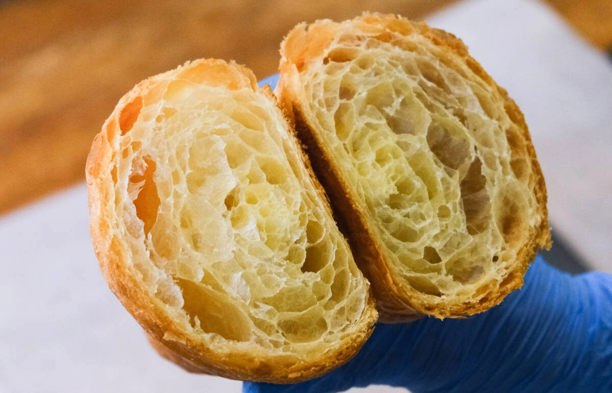В производстве используют только качественное масло из Новой Зеландии. Оно не только добавляет в выпечку те самые сливочные ноты, но и играет важную роль в технологии приготовления. Пласты масла, с которым чередуют тесто, не дают ему слипнуться и образуют пустоты, которые мы видим при разрезе. Именно таким круассан попадает к вам на стол: вкусным, ароматным и воздушным.