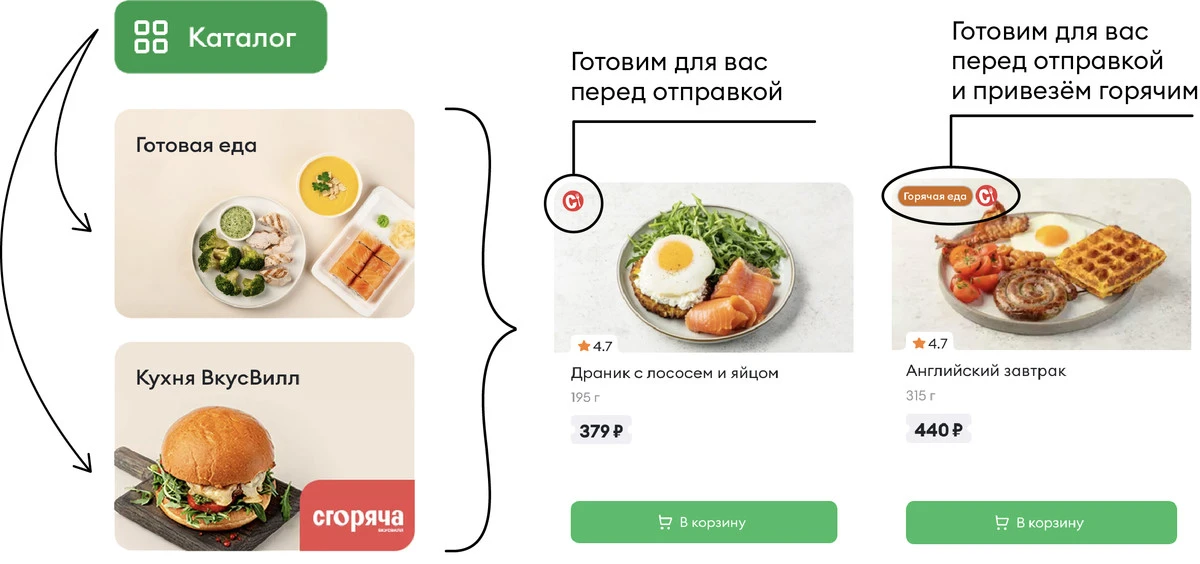 Кстати, именно по шильдику «Сгоряча» (специальной пометке в карточке товара) можно найти в каталоге продукты, которые готовят непосредственно перед отправкой с курьером покупателю: