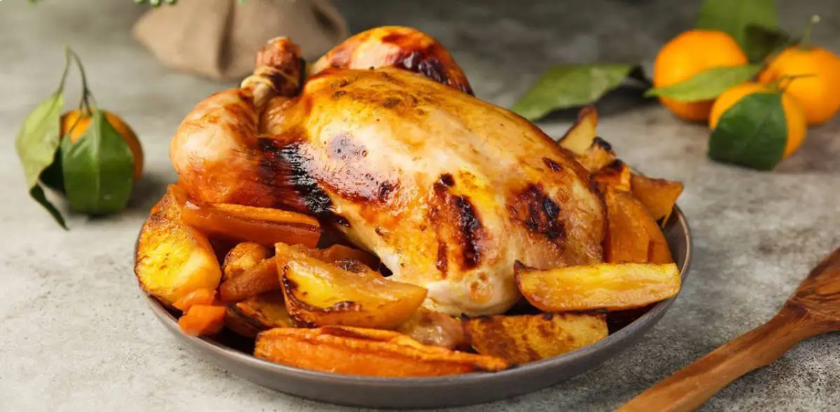 Такая курица украсит любой праздничный стол, а готовится она легко и довольно быстро! Вместо батата можно взять тыкву или морковь, а можно запечь все овощи вместе.