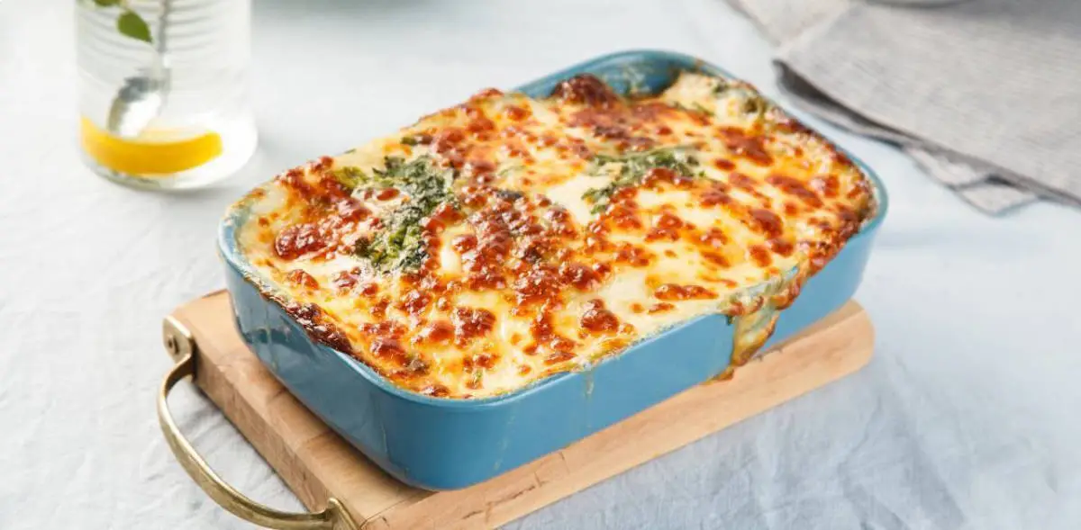 7. В глубокую форму для запекания выложите немного соуса бешамель, затем слоями картошку, фарш, овощную зажарку, баклажаны. Повторите слои, залейте оставшимся соусом, выложите сверху кружочки моцареллы и рубленую петрушку. Запекайте в разогретой до 180°С духовке 15-20 минут до золотистой корочки.