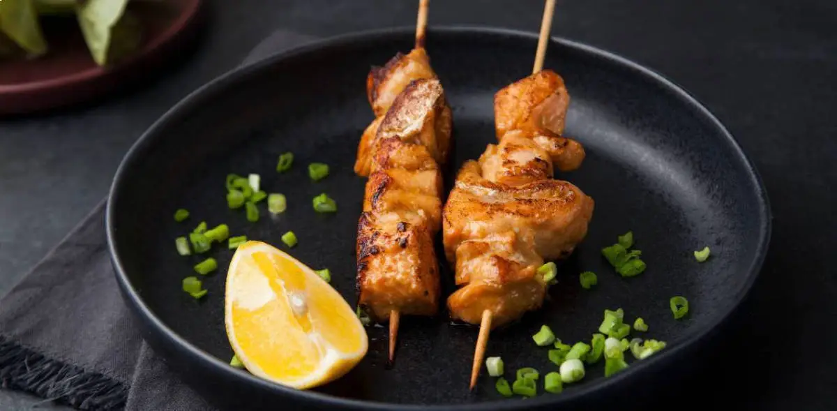 5. Зелёный лук нарежьте колечками, посыпьте шашлычки и подавайте.