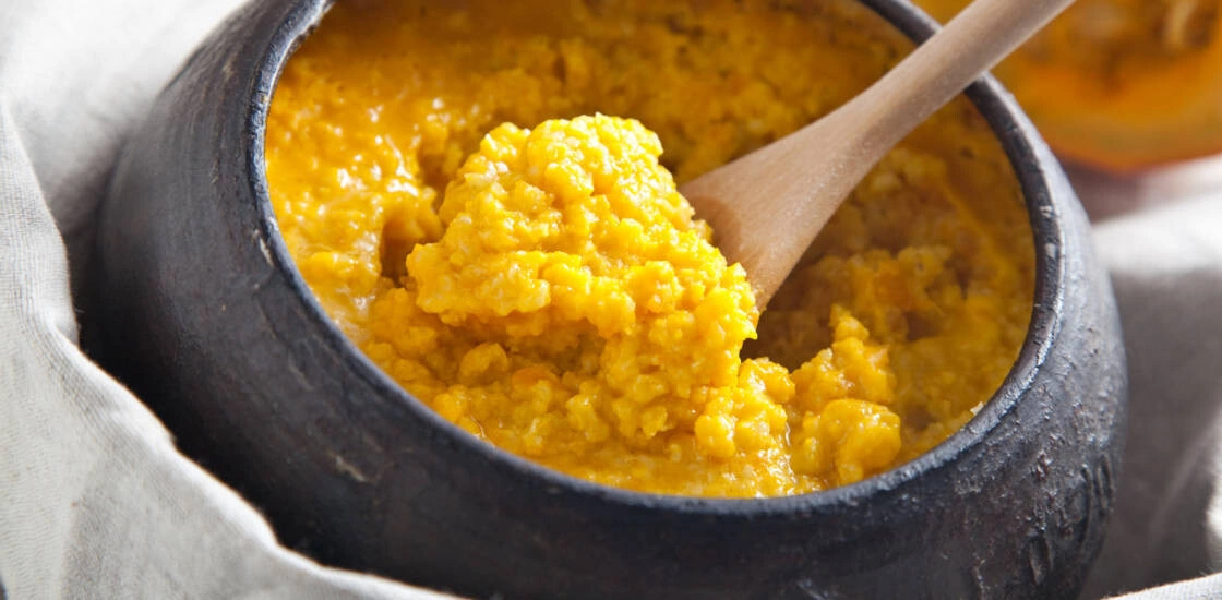 - Готовую тыкву измельчите толкушкой в пюре, всыпьте пшено и залейте молоком. Готовьте в духовке при 150 °C в закрытом крышкой или фольгой горшочке около часа.