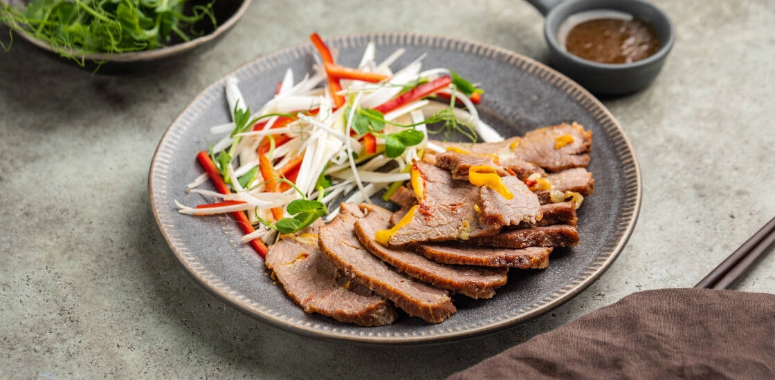 - Готовое мясо тонко нарежьте, полейте мясным соком (который выделился во время готовки). Подавайте с обжаренным пореем и перцем, украсив микрозеленью гороха.