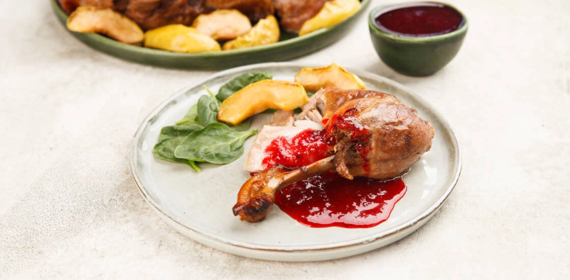 - В конце приготовления можно снять крышку/надорвать пакет и подрумянить утку под грилем при 200 °С в течение 5-10 минут. Подавайте утку с протёртой клюквой и салатом из свежей зелени.