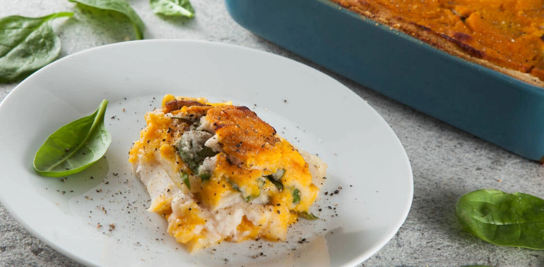 - Выложите в форму слоями: сельдерей, тыквенный соус, шпинат, «бешамель», сельдерей, тыквенный соус, шпинат, «бешамель» и т. д. Завершить лучше тыквенным соусом. Сверху по желанию можно посыпать сыром и украсить чёрным перцем. Выпекайте лазанью до мягкости — минут 30. Подавайте горячей.