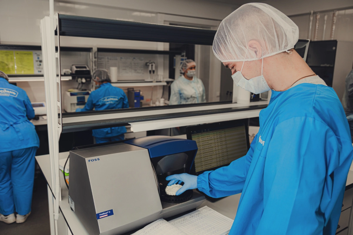 «Охлаждённое до четырёх градусов молоко приезжает к нам в молоковозах. Мы сразу забираем образцы из каждой цистерны и несём их в лабораторию. Там измеряем температуру, кислотность, количество соматических клеток , которые говорят о гигиене и здоровье коровы, и прочие показатели. Если всё хорошо, молоковоз направляем на приёмку, где молоко перегоняют в специальные танки. Если есть отклонения по каким-то показателям, разбираемся, где произошёл сбой. Если тест показал в молоке антибиотики, вернём продукт хозяйству. Но такого на моей практике не было», — делится исполнительный директор.