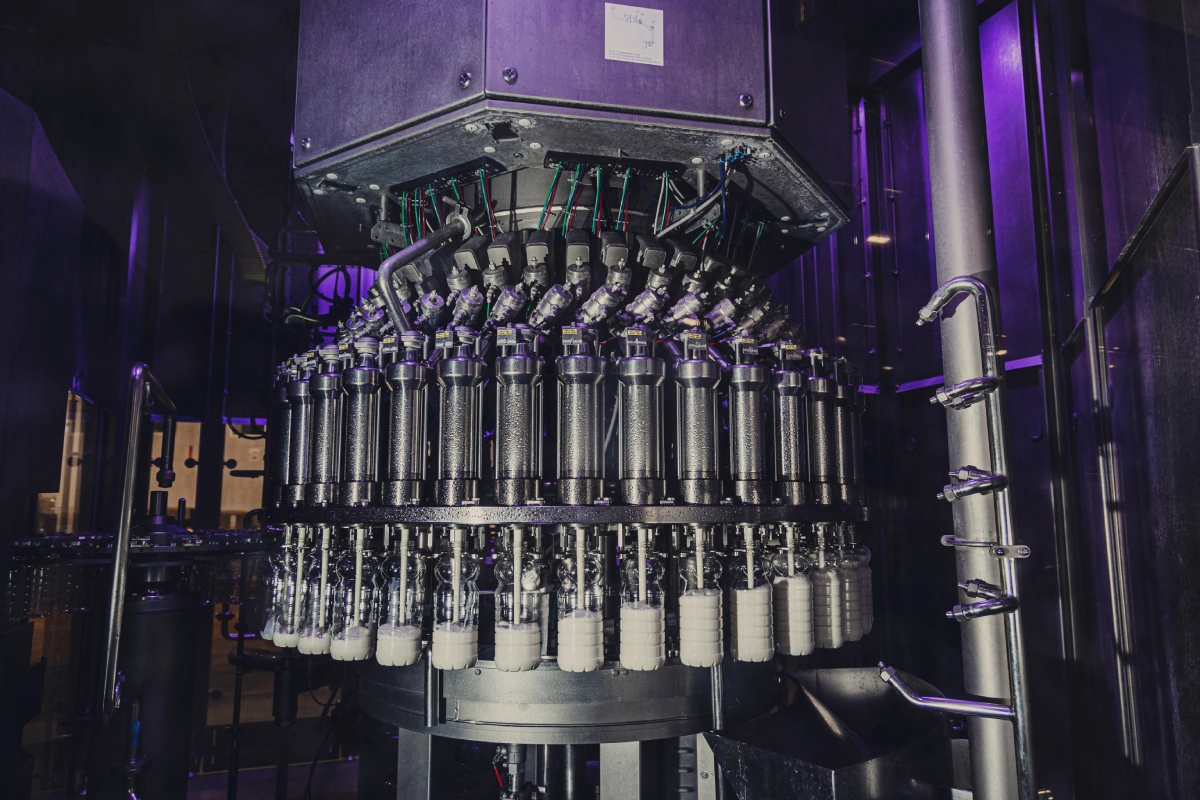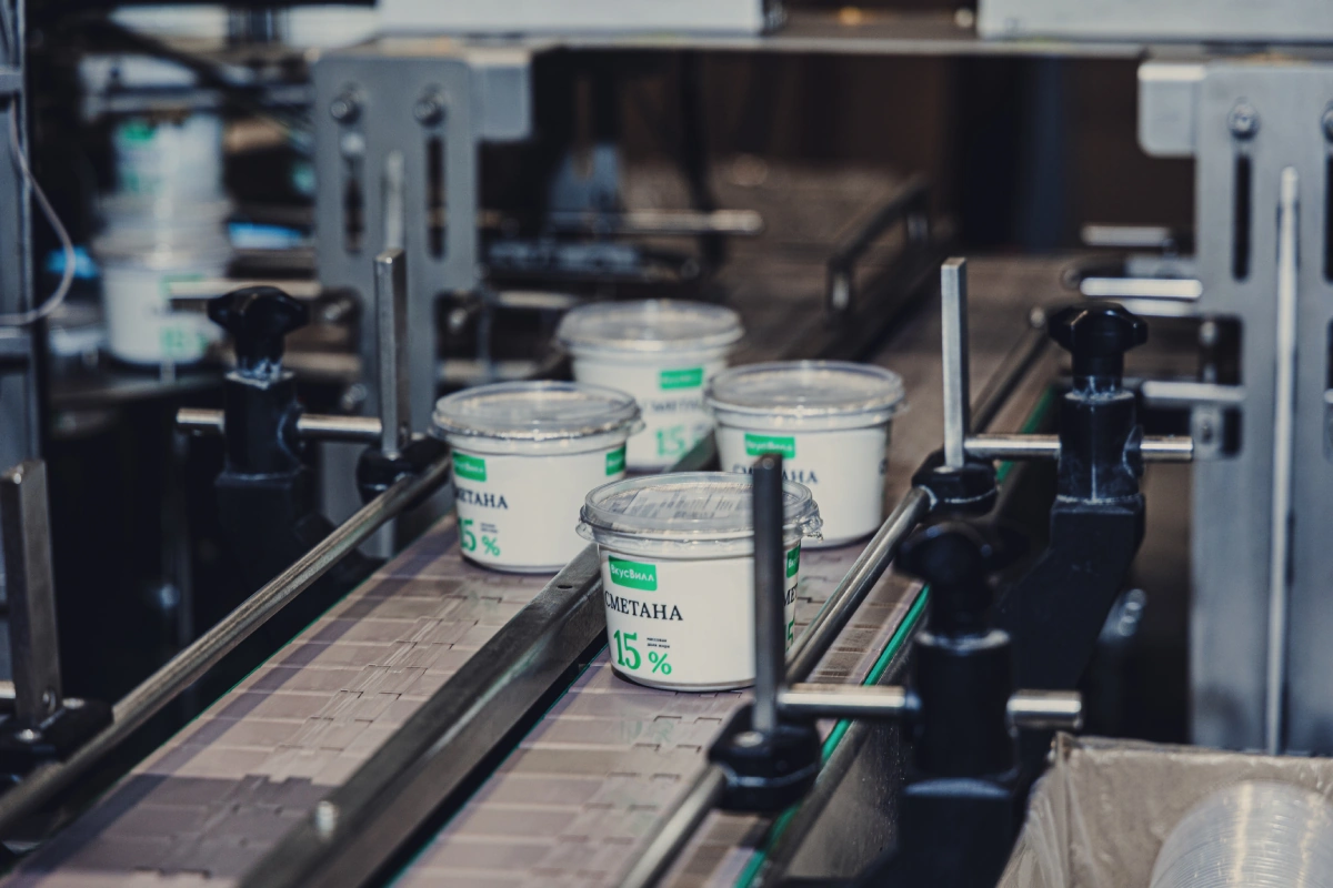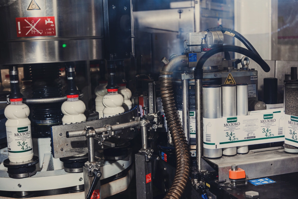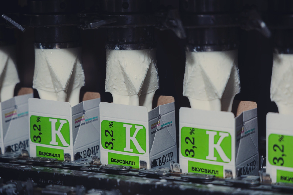 «Один из основных продуктов, который мы отгружаем во ВкусВилл, — молоко в бутылках. У нас есть специальная линия, которая позволяет делать бутылки и сразу наполнять их молоком, — делится Александр Викторович. Преформа — это заготовка из сухого армирующего материала. При нагревании преформа становится пластичной, и из неё легко получаются бутылки. Они сразу же отправляются на станцию розлива и наполняются молоком. Затем полная бутылка закупоривается и едет на этикетировку».